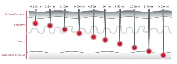 Dermarolling is a an oldest and surest way of skin tightening. Dermaroller is a small devise which has a round roller like structure with multiple needles on it. Depending upon length of needle we number the dermarollers a 0.5 mm, 1 mm ,1.5 mm or 2 mm. Sizes up to 3 mm are available.
